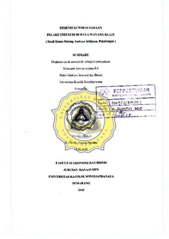 Pratama, G. Christy Agung (2015) DlMENSI KEWlRAUSAHAAN PELAKU INDUSTRI BUDAYA WAYANG KULIT ( STUDI KASUS DALANG ANDREAS SRIDJONO, PEKALONGAN). Other thesis, UNIKA SOEGIJAPRANATA SEMARANG.