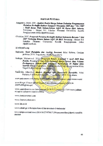 Penelitian ini bcrtujuan untuk mengeiahui reaksi harga saham terhadap pengurnuman penstiwa pcmbenrukan Kabinct pada ranggal 21 Oktober 2009 oleh Presiden Susilo Bambang Yudhoyono dan perisnwa pembentukan Kabinet 27 Oktober 1014 oleh Pre idcn Joko \J idodo. Sarnpel yang digunakan dalam pencJitian ini adalah saharn-saham yang terdaltar dalam indcks LQ45 pada pcriode Oktober 2009 dan peri ode Oktober 2014 dengan peri ode pcngamatan elama sebelas han. Teknik pengumpulan data yang digunakan adalah tcknik pcngumpulan data dokumentcr. Tekruk analisis data yang digunakan pada peneliiian ini adalah metode Event study dengan mcnggunakan model pasar disesuaikan tXtarker adjusted model). Ha il dalam penclitian ini menyatakan bahwa terdapat reaksi harga saham yang srgnifikan rerhadap peristiwa pcmbentukan kabinet pada ranggal tanggal 21 Oktober 2009 dan 27 Oktober 2014. Ha il tcrsebut didasarkan dari hasil uji-t yang menunjukkan bahw a dalam sebelas han p riodc pcngamat.in yang dilakukan. tujuh hari dianraranya menunjukkan nilai rata-rata abnormal refilm yang signifikan, sedangkan cmpat han lain mcnunjukkan nilai rata-rata abnormal return yang tidak signifikan.