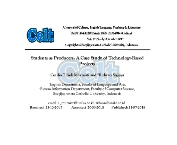 MURNIATI, CECILIA TITIEK and SANJAYA, RIDWAN Students as Producers: A Case Study of Technology-Based Projects. Celt: A Journal of Culture, English Language Teaching & Literature. ISSN 2502-4914