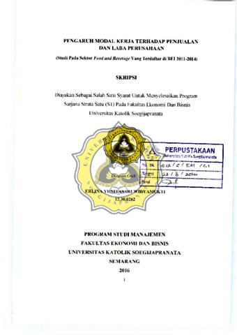 Widyamukti, Erlina Yunitasari (2016) PENGARUH MODAL KERJA TERHADAP PENJUALAN DAN LABA PERUSAHAAN. Other thesis, UNIKA SOEGIJAPRANATA SEMARANG.