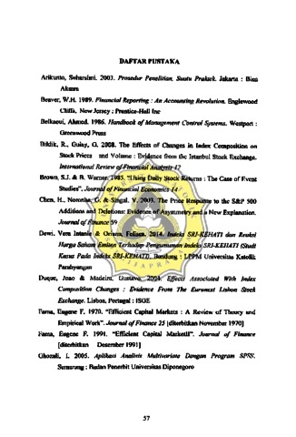 Hal yang menjadi Jatar beJakang dari penelitian ini adalah munculnya masaIah lingkungan dan sosial yang menjadi perhatian sebagian besar aktivis lingkungan. Indeks SRI- kEHATI menjadi salah satu bentuk usaha yang dilakukan oleh aktivis lingkungan Yayasan I'\.EHA TI untuk menanggulangi masalah terse but yang merupakan bentuk kerja sarna dengan I~ursa Efek Indonesia. Tujuan dari penelitian ini adalah untuk mengetahui ada tidaknya kandungan infonnasi pada peristiwa inklusi dan! atau eksklusi saham kedalam dan! atau dari daftar Indeks SRI- ~EHATI sehingga direaksi oleh pasar. Penelitian ini merupakan sebuah event study yang rnenggunakan windows period selama 11 h8ri perdagangan efektif yang ada di pasar atau 5 hari perdagangan sebelum tanggal pengumuman (t-5) sampai 5 hari perdagangan setelah ranggal pengumuman (t+5). Pengamatan dilakukan dengan melihat abnormal return yang ierbentuk, di mana abnormal return yang terbentuk dihitung dengan market-adjusted model IJogiyanto, 2008). Peneliti menggunakan 15 saham yang masuk (inklusi) kedalam dan 15 saham yangkeluar (eksklusi) dari Indeks SRI-KEHATI selama periode tahun 2009 sampai tahun 2014 sebagai sampel penelitian. Hasil yang diperoleh dari penelitian ini menunjukkan bahwa pasar Iidak bereaksi terhadap peristiwa inklusi dan eksklusi saham kedalam dan dari Indeks SRI- KEHA TI. Abnormal return di dalam windows period di sekitar peristiwa adalah tidak signi fikan sehingga peristiwa dapat dikatakan tidak rnemiliki kandungan informasi.