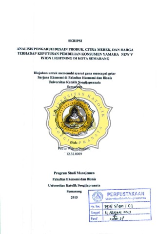 Sugiarto, Petrus Wijaya (2015) ANALISIS PENGARUH DESAIN PRODUK, CITRA MEREK, DAN HARGA TERHADAP KEPUTUSAN PEMBELlAN KONSUMEN YAMAHA NEW V-IXION LIGHTNING DI KOTA SEMARANG. Other thesis, UNIKA SOEGIJAPRANATA SEMARANG.
