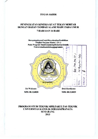 Widianto, Tri and Hardiyana, Dedi (2013) PENINGKATAN KINERJA KUAT TEKAN MORTAR DENGAN BAHAN TAMBAH ALAMI MADU PADA UMUR 7 HARI DAN 14 HARI. Other thesis, UNIKA SOEGIJAPRANATA SEMARANG.