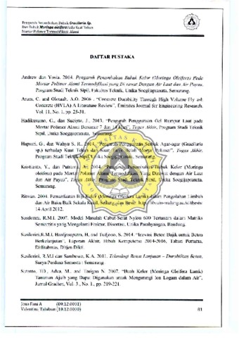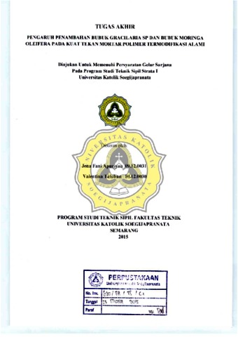 Apuriyau, Jena Fani and Talubun, Valentina (2015) PENGARUH PENAMBAHAN BUBUK GRACILARIA SP DAN BCBUK MORINGA OLEIFERA PADA KUAT TEKAN MORTAR POLIMER TERMODIFIKASI ALAMI. Other thesis, UNIKA SOEGIJAPRANATA SEMARANG.