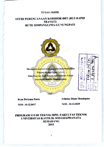 Putra, Ryan Dwiyana and Mendopma, Felisitas Diane (2015) STUDI PERENCANAAN KORIDOR BRT (BUS RAPID TRANSIT) RUTE SIMPANGLIMA - GUNUNGPATI. Other thesis, UNIKA SOEGIJAPRANATA SEMARANG.