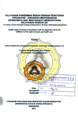 LELIAWATY, - (2011) PELAYANAN PUSKESMAS SESUAI DENGAN PERATURAN PERUNDANG-UNDANGAN MENYEBABKAN DIPENUHINYA HAK MASYARAKAT MENDAPATKAN PELAYANAN KESEHATAN (Penelitian Hukum Normatif Undang-Undang Nomor 36 tahun 2009 tentang kesehatan). Masters thesis, Unika Soegijapranata Semarang.