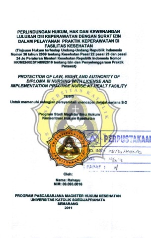 RAHAYU, - (2011) PERLINDUNGAN HUKUM, HAK DAN KEWENANGAN LULUSAN DIII KEPERAWATAN DENGAN SURAT IZIN DALAM PELAYANAN PRAKTIK KEPERAWATAN DI FASILITAS KESEHATAN (Tinjauan Hukum terhadap Undang-Undang Republik Indonesia Nomor 36 tahun 2009 tentang Kesehatan Pasal 22 pasal 23 dan pasal 24 jo Peraturan Menteri Kesehatan Republik Indonesia Nomor HK/MENKES/148/I/2010 tentang Izin dan Penyelenggaraan Praktik Perawat). Masters thesis, Unika Soegijapranata Semarang.