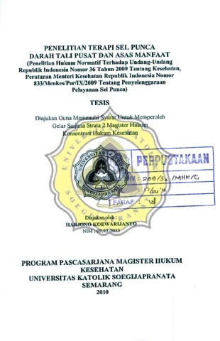 KOEWARIJANTO, HARJONO (2010) PENELITIAN TERAPI SEL PUNCA DARAH TALI PUSAT DAN ASAS MANFAAT (Penelitian Hukum Normatif terhadap Undang-Undang Republik Indonesia Nomor 36 Tahun 2009 tentang Kesehatan, Peraturan Menteri Kesehatan Republik Indonesia Nomor 833/Menkes/Per/IX/2009 tentang Penyelenggaraan Pelayanan Sel Punca). Masters thesis, Unika Soegijapranata Semarang.