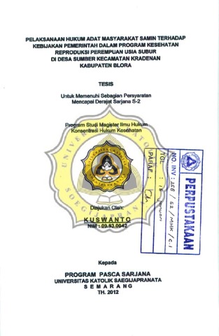 KUSWANTO, - (2012) PELAKSANAAN HUKUM ADAT MASYARAKAT SAMIN TERHADAP KEBIJAKAN PEMERINTAH DALAM PROGRAM KESEHATAN REPRODUKSI PEREMPUAN USIA SUBUR DI DESA SUMBER KECAMATAN KRADENAN KABUPATEN BLORA. Masters thesis, Unika Soegijapranata Semarang.