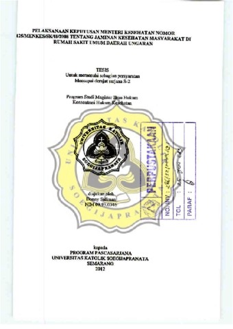 SALIMAN, DONNY (2012) PELAKSANAAN KEPUTUSAN MENTERI KESEHATAN NOMOR 125/MENKES/SK/II/2008 TENTANG JAMINAN KESEHATAN MASYARAKAT DI RUMAH SAKIT UMUM DAERAH UNGARAN. Masters thesis, Unika Soegijapranata Semarang.