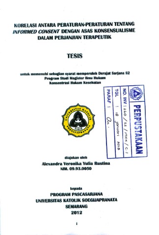 RUSTINA, ALEXANDRA VERONIKA YULIA (2012) KORELASI ANTARA PERATURAN-PERATURAN TENTANG INFORMED CONSENT DENGAN ASAS KONSENSUALISME DALAM PERJANJIAN TERAPEUTIK. Masters thesis, Unika Soegijapranata Semarang.