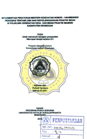HANDOYO, RUBADI (2012) IMPLEMENTASI PERATURAN MENTERI KESEHATAN NOMOR 1464/MENKES/PER/X/2010 TENTANG IZIN DAN PENYELENGGARAAN PRAKTIK BIDAN DI POLIKLINIK KESEHATAN DESA DAN BIDAN PRAKTIK MANDIRI KABUPATEN GROBOGAN. Masters thesis, Unika Soegijapranata Semarang.