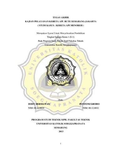 HERMAWAN, DODY (2013) KAJIAN PELAYANAN KERETA API RUTE SEMARANG - JAKARTA (STUDI KASUS : KERETA API MENOREH). Other thesis, Prodi Teknik Sipil Unika Soegijapranata.