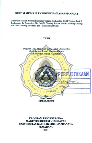 YENDI, - (2011) REKAM MEDIS ELEKTRONIK DAN ASAS MANFAAT (Penelitian Hukum Normatif terhadap Undang-Undang No. 29/04 tentang Praktik Kedokteran jo Permenkes No. 269/08 Tentang Rekam Medis, Undang-Undanag No.11/08 Tentang Informasi dan transaksi elektronik). Masters thesis, Unika Soegijapranata Semarang.