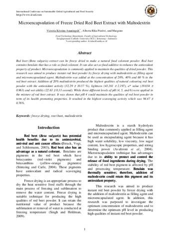 Ananingsih, Victoria Kristina and Pratiwi, Alberta Rika and Margono, Margono Microencapsulation of Freeze Dried Red Beet Extract with Maltodextrin. Microencapsulation of Freeze Dried Red Beet Extract with Maltodextrin. pp. 1-4.