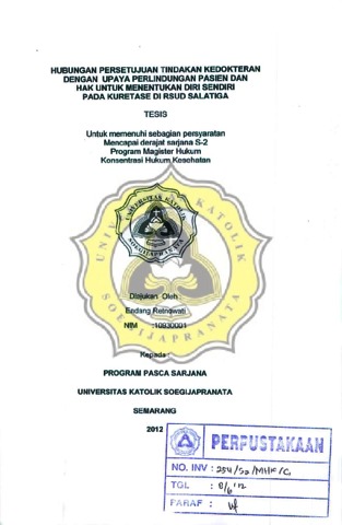 RETNOWATI, ENDANG (2012) HUBUNGAN PERSETUJUAN TINDAKAN KEDOKTERAN DENGAN UPAYA PERLINDUNGAN PASIEN DAN HAK UNTUK MENENTUKAN DIRI SENDIRI PADA KURETASE DI RSUD SALATIGA. Masters thesis, Unika Soegijapranata Semarang.