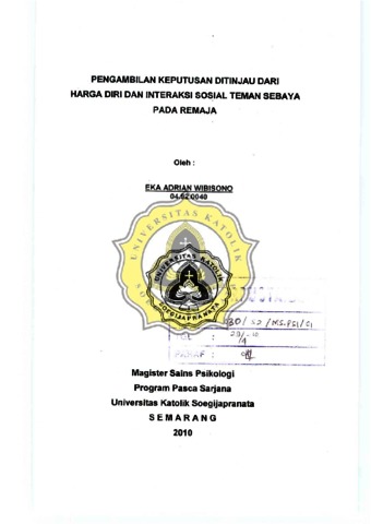 WIBISONO, EKA ADRIAN (2010) PENGAMBILAN KEPUTUSAN DITINJAU DARI HARGA DIRI DAN INTERAKSI SOSIAL TEMAN SEBAYA PADA REMAJA. Masters thesis, UNIKA SOEGIJAPRANATA SEMARANG.