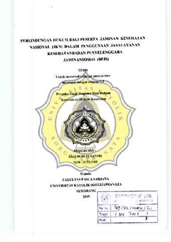 SANTOSO, EKO BUDI (2015) PERLINDUNGAN HUKUM BAGI PESERTA JAMINAN KESEHATAN NASIONAL (JKN) DALAM PENGGUNAAN JASA LAYANAN KESEHATAN BADAN PENYELENGGARA JAMINAN SOSIAL (BPJS). Masters thesis, Unika Soegijapranata Semarang.