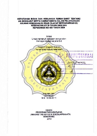 LESTARI, UTI (2012) KEPATUHAN BIDAN DAN KEBIJAKAN RUMAH SAKIT TENTANG ASI EKSLUSIF SERTA HAMBATANNYA DALAM PELAKSANAAN ASUHAN KEBIDANAN DI RSUD CILACAP BERDASARKAN UU KESEHATAN NO. 38 TAHUN 2009 DAN KEPMENKES NO. 450 TAHUN 2004. Masters thesis, Unika Soegijapranata Semarang.