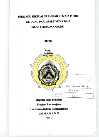 Rejeki, Sri (2011) PERILAKU SEKSUAL PRANIKAH REMAJA PUTRI DITINJAU DARl ASERTIVITAS DAN SIKAP TERHADAP ABORSI. Masters thesis, UNIKA SOEGIJAPRANATA SEMARANG.