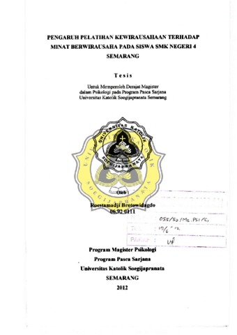 Brotowidagdo, Roestamadji (2012) PENGARUH PELATHAN KEWIRAUSAHAAN TERHADAP MINAT BERWIRAUSAHA PADA SISWA SMK NEGERI 4 SEMARANG. Masters thesis, UNIKA SOEGIJAPRANATA SEMARANG.