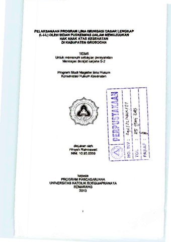 RAHMAWATI, FITRIYAH (2013) PELAKSANAAN PROGRAM LIMA IMUNISASI DASAR LENGKAP (L-I-L) OLEH BIDAN PUSKESMAS DALAM MEWUJUDKAN HAK ANAK ATAS KESEHATAN DI KABUPATEN GROBOGAN. Masters thesis, Unika Soegijapranata Semarang.