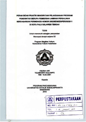 KOLOMPO, YULMINARTI (2012) PERAN BIDAN PRAKTIK MANDIRI DAN PELAKSANAAN PROGRAM PEMERINTAH BERUPA PEMBERIAN JAMINAN PERSALINAN BERDASARKAN PERMENKES NOMOR 2562/MENKES/PER/XII/2011 DI KOTA PALU SULAWESI TENGAH. Masters thesis, Unika Soegijapranata Semarang.