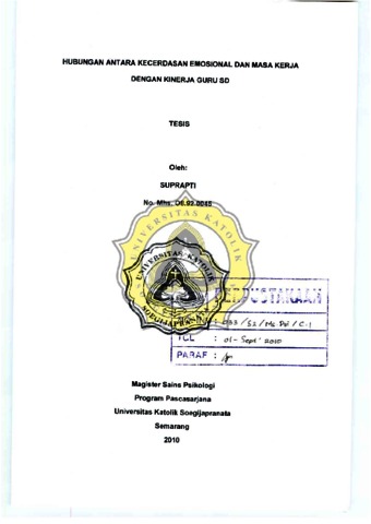 SUPRAPTI, SUPRAPTI (2010) HUBUNGAN ANTARA KECERDASAN EMOSIONAL DAN MASA KERJA DENGAN KINERJA GURU SD. Masters thesis, UNIKA SOEGIJAPRANATA SEMARANG.