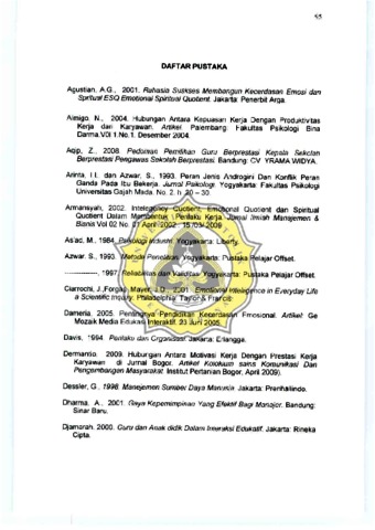Penelitian mi bertujuan untuk menguji secara emprrik hubungan antara Kecerdasan Emosional dan Masa Kerja dengan Kmerja Guru SO Hipotesis penelitian yang diajukan adalah pertama ada hubungan antara kecerdasan emosronal dan masa kerja dengan kinerja. Hipotesis kedua, ada hubungan positif antara kecerdasan emosional dengan kmerja Guru SO dan ada hubungan positif antara masa kerja dengan kinerja Guru SO. Subyek penelitian in! adalah para guru SO Yayasan Asti Dharma Cabang Tegal yang berjurnlah 52 orang Penqarnbuan sampel dilakukan dengan teknik cluster random sampling Alat ukur yang dlgunakan untuk penelitian ini adalah skala kecerdasan ernosional dan skala penilaian kinerja. Data masa kerja diperoleh dari dokumen sekolah Skala penilaran kinerja, diisi oleh atasan langsung para guru yaitu kepala sekolah skala kecerdasan emosional dilsi oleh para guru. Hasil analisis regresi dengan dua prediktor menqhasukan persamaan sebagai benkut Y= 226529 + 1 436xl + O.048X2 dengan nilai R= 0,565 dengan F= 11 504 dan tarat stqnif an p<O 01 rnenunjukkan adanya hubungan yang sang at slgnifikan antara kecerdasan emosional dan masa kerja dengan kinerja guru SO. seram itu rnenunjukkan pula ada hubungan positif yang sang at slgnlfikan antara kecerdasan ernosronal dengan kinerja Guru SO dan ada hubungan positif yang sangat siqnifikan antara masa kerja dengan kinerja Guru SO.