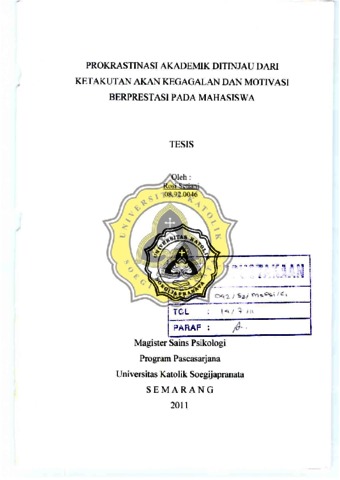 Setiani, Rosi (2011) PROKRASTlNASI AKADEMIK DITINJAU DARI KETAKUTAN AKAN KEGAGALAN DAN MOTIVASI BERPRETASI PADA MAHASISWA. Masters thesis, UNIKA SOEGIJAPRANATA SEMARANG.