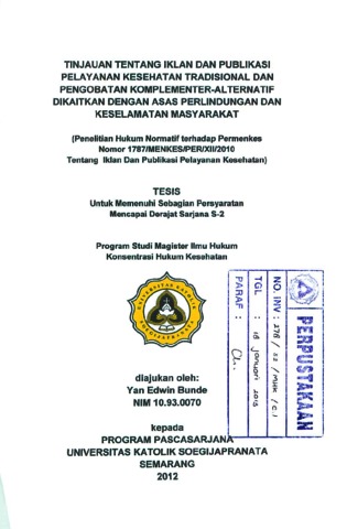 BUNDE, YAN EDWIN (2012) TINJAUAN TENTANG IKLAN DAN PUBLIKASI PELAYANAN KESEHATAN TRADISIONAL DAN PENGOBATAN KOMPLEMENTER-ALTERNATIF DIKAITKAN DENGAN ASAS PERLINDUNGAN DAN KESELAMATAN MASYARAKAT (Penelitian hukum normatif terhadap Permenkes No. 1787/Menkes/Per/XII/2010 tentang Iklan dan Publikasi Pelayanan Kesehatan). Masters thesis, Unika Soegijapranata Semarang.