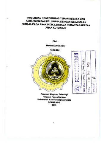 Asih, Martha Kurnia (2013) HUBUNGAN KONFORMITAS TEMAN SEBAYA DAN KEHARMONISAN KELUARGA DENGAN KENAKALAN REMAJA PADA ANAK DIDIK LEMBAGA PEMASYARAKATAN ANAK KUTOARJO. Masters thesis, UNIKA SOEGIJAPRANATA SEMARANG.