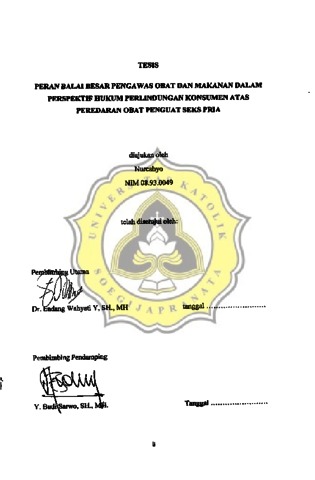 NURCAHYO, - (2011) PERAN BALAI BESAR PENGAWAS OBAT DAN MAKANAN DALAM PERSPEKTIF HUKUM PERLINDUNGAN KONSUMEN ATAS PEREDARAN OBAT PENGUAT SEKS PRIA. Masters thesis, Unika Soegijapranata Semarang.