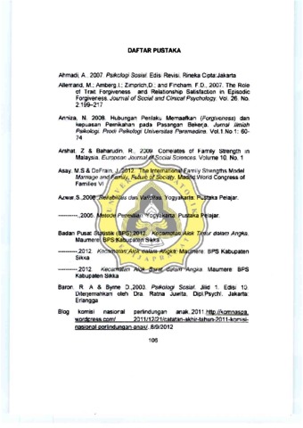 Penehtian ini bertujuan untuk mengetahui hubungan antara nila:dalam perkawinan dan pemaafan dengan keharrnorusan keluarga. Hipotesis mayor dalam penelitian Ini adalah teroapat hubungan posuif antara rulai dalam perkawinan dan pemaafan dengan keharmonisan keluarga, sedangkan rupotesrs minor berbunyi (1) terdapat hubungan positif antara rulai dalam perkawinan dengan keharmonisan keluarga dan (2) terdapat hubungan posrnf antara pemaafan dengan keharmonisan keluarga. Metode yang dlgunakan adalah metode penelitran uantnatit Sampel penehtian Ini adalah pasangan suarm istri yang tlnggal dl wllayah Kecamatan Alok Timur Kecamatan Alok dan kecamatan Alok Barat, Kota Maumere, Kabupaten Srkka yang berjumlah 100 pasang. Alat ukur yang digunakan adalah skala xeharrnorusan keluarga untuk mengukur keharmonisan keluarga skala n lal datam perkawinan untuk mengukur nllai dalam perkawinan dan mornfikas: ForgIveness Scale dari Rye untuk mengukur pemaafan Data d kunplJlkar rre,ah.J1scala yang diisi oleh pasangan suarm istri dan setaruutnya dranausis dengan teknik analisis regresi dua prediktor untuk tupotesis mayor dan teknik korelast korelasi bivariat untuk tupotesis minor Hasil penelitian nenunjukkan bahwa (1) terdapat hubungan posmf antara rulai dalam perkawman dan pemaafan dengan keharmonisan keluarga (2) terdapat hubungan positif antara nllal dalam perkawrnan dengan keharmonisan keluarga (3) terdapat hubungan positif antara pemaafan dengan keharmornsan keluarga