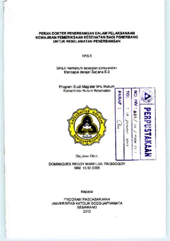 TINGGOGOY, DOMINIQUES REGGY MARFILAN (2012) PERAN DOKTER PENERBANGAN DALAM PELAKSANAAN KEWAJIBAN PEMERIKSAAN KESEHATAN BAGI PENERBANG UNTUK KESELAMATAN PENERBANGAN. Masters thesis, Unika Soegijapranata Semarang.