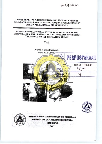 Indriyanti, Nurma Yunita (2007) STUDI KlJALITAS AIR SlJMUR DANGKAL KAWASAN PESISIR SEMARANG (KELURAHAN TANJlJNG MAS) DAN PENGEMBANGAN DESAIN PENY ARINGAN AIR SEOERHANA. Masters thesis, UNIKA SOEGIJAPRANATA SEMARANG.
