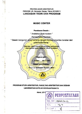 L. ARDIAN, - (2011) LTP MUSIC CENTER Penekanan desain : Arsitektur Post-modern. Other thesis, Unika Soegijapranata Semarang.