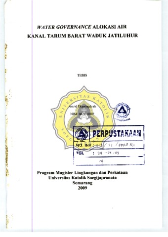 Ekaningdyah, Astrid (2009) WATER GOVERNANCE ALOKASI AIR KANAL TARUM BARAT WADUK JATILUHUR. Masters thesis, UNIKA SOEGIJAPRANATA SEMARANG.