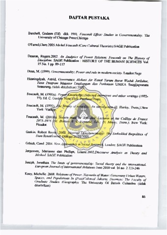 Jatiluhur Dam located in Purwakarta Regency is a reservoir that was built to serve the water needs of West Java and Jakarta are also generating electricity (hydropower). Along with the growing needs and rising . Jatiluhur drain the water through three artificial channels, namely the West Tarum Canal, East Tarum Canal and the North Tarum Canal. From the three channels used to drain the water, West Tarum Canal was the most diverse use of water. West Tarum Canal channel is also part of the Citarum River. Manager Jatiluhur is Jasa Tirta II Public Corporation (pJT /1). While the West Tarum Canal which is part of the Citarum river management under Balai Besar Wi/ayah Sungai (BBWS) Citarum. To meet various needs, the water that flowed from the Canal Jatiluhur West Tarum arranged in a water allocation mechanism. In practice the power of this mechanism occurs in water resources. The practice of allocation of the West Tarum Canal Jatiluhur is a form of population control. About the allocation of water is planned to flow, showing how power relations work among the actors / agencies / institutions that have an interest in the water from the reservoir through the Canal Tarum Jatiluhur the West. Interest on the water in the West Tarum Canal become the object of state pawer and multinational institutions. State through its institutions and foreign interests through ICWRMIP program (Integrated Citarum Water Resources Management Improvement Plan) practice of power.Governmentality theory hatched by Michael Foucault became the baSIS of the theory to know "How 10 practice operating power and resistance to it take place in the alloca lion of water from the West Tarum Canal.Iatiluhur?". Secondary and primary data from survey results in the genealogy analysis in three stages: I) studying the le~al basis for water management institutions Jatiluhur especially in West Tarum Canal, 2) Assessing the power of the strategy that was practiced in the allocation of water, 3) Assessing the resistance that took place in practice of power.The results of this study indicate that the practice of power over the allocatt on of water in the West Tarum Canal takes place in two phases, namely liberal and neoliberal governmentality. In the first phase of the dominant power in the hands of countries and donors In the second phase lakes over. Means employed in practicing the power ofthe two phases are equal (with sovereign power, disciplinary power and biopower. Rationality is still the most effective strategy of domination. This shows that the power resource management practiced rational )l'ay would make the subject the power 10 be obedient and resistance can be muted.