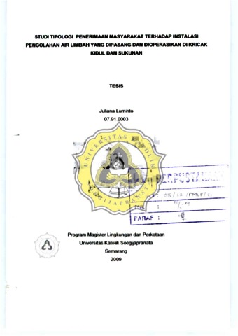 Luminto, Juliana (2009) STUDI TIPOLOGI PENERIMAAN MASYARAKAT TERHADAP INSTALASI PENGOLAHAN AIR LIMBAH YANG DIPASANG DAN DIOPERASIKAN DI KRICAK KIDUL DAN SUKUNAN. Masters thesis, UNIKA SOEGIJAPRANATA SEMARANG.