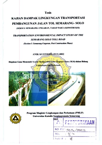kustirini, Anik (2012) KAJIAN DAMPAK LINGKUNGAN TRANSPOTASI PEMBANGUNAN JALAN TOL SEMARANG - SOLO. Masters thesis, UNIKA SOEGIJAPRANATA SEMARANG.