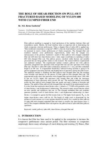 Fiber pull-out modeling is engaged to bond mechanism of the interface between fiber and cementitious matrix. Hereby, the bond interface takes an important role in determining the whole composites structure performance. When a slippery fiber of nylon 600 is applied into fiber-reinforced cementitious composite (FRCC), then the bond interface mechanism should be increased to reach a better performance of whole composites. The clumped fiber end condition indicates some performance improvements, rather than the straight one. Advancement of the previous Susilorini’s model of fiber pull-out with clumped embedded fiber end will show that shear-friction stress takes major contribution in modeling of nylon 600 with clumped fiber end. The pull-out process involved stable fracture and unstable processed that are being specific interest in this research. The research delivers experimental and analytical methods. The experimental method conducts pull-out test with pull-out specimens categorized into specimens with straight fiber end and also specimens with clump fiber end. The fiber is nylon 600 made in Indonesia, diameter of 1.1 mm, and fiber embedded length lf of 100 mm. A computerized closed-loop universal testing machine is going to be precise equipment measuring the load and displacement of specimens during the pull-out test. The analytical method is modeling the fiber pull-out with clumped fiber end and resulting some formulas and theories for the process of fiber pull-out with clumped fiber end. The experimental results show that specimens with clumped fiber end reach loads about 1200-1400 N that are 14-35% higher that specimens with straight fiber end while the maximum displacement of those specimens reach around 100 mm. The analytical method successfully results the fiber pull-out with clumped fiber end model, and meet a finding of formulas and theories. The model of fiber pull-out with clumped fiber end model fit the experimental results.