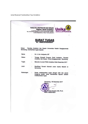 Ardiyanto, Antonius and Susilo, Rudyanto and Suroto, Valentinus and Prawoto, Hudi (2015) Modifikasi Rumah Kolonial untuk Usaha Mandiri di Semarang. Modifikasi Rumah Kolonial untuk Usaha Mandiri di Semarang, 15 (2). pp. 127-132. ISSN 2460-6367