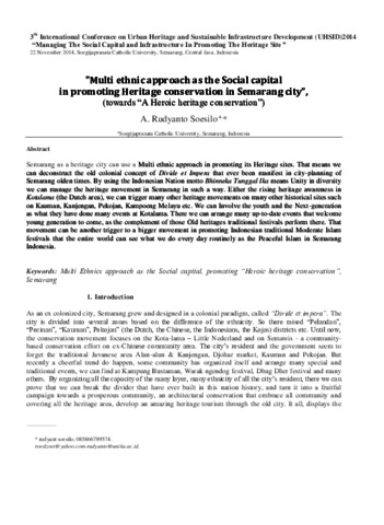 Soesilo, Rudyanto (2014) "Multi ethnic approach as the Social capital in promoting Heritage conservation in Semarang city”. Semarang as a heritage city can use a Multi ethnic approach in promoting its Heritage sites. That means we can deconstruct the old colonial concept of Divide et Impera that ever been manifest in city-planning of Semarang olden times. By using the Indonesi. pp. 1-4.