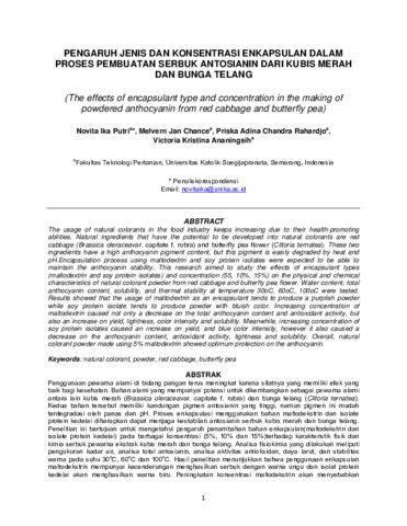 Putri, Novita Ika and Chance, Melvern Jan and Rahardjo, Priska Adina Chandra and Ananingsih, Victoria Kristina PENGARUH JENIS DAN KONSENTRASI ENKAPSULAN DALAM PROSES PEMBUATAN SERBUK ANTOSIANIN DARI KUBIS MERAH DAN BUNGA TELANG. PENGARUH JENIS DAN KONSENTRASI ENKAPSULAN DALAM PROSES PEMBUATAN SERBUK ANTOSIANIN DARI KUBIS MERAH DAN BUNGA TELANG, 18 (1). ISSN 1411-7096