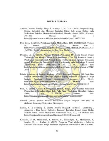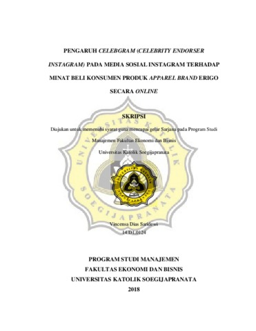 Saridewi, Vincensa Dias (2018) PENGARUH CELEBGRAM (CELEBRITY ENDORSER INSTAGRAM) PADA MEDIA SOSIAL INSTAGRAM TERHADAP MINAT BELI KONSUMEN PRODUK APPAREL BRAND ERIGO SECARA ONLINE. Other thesis, UNIKA SOEGIJAPRANATA SEMARANG.
