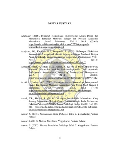 Penelitian ini bertujuan untuk menguji secara empiris hubungan komunikasi interpersonal mahasiswa dengan dosen pembimbing dengan motivasi menyusun skripsi. Hipotesis penelitian adalah terdapat hubungan positif antara komunikasi interpersonal mahasiswa dengan dosen pembimbing terhadap motivasi menyusun skripsi. Semakin baik komunikasi interpersonal yang terjadi maka semakin tinggi pula motivasinya. Subyek dari penelitian ini adalah mahasiswa Fakultas Teknologi Pertanian Progdi Teknologi Pangan Universitas Katolik Soegijapanata Semarang. Teknik pengambilan sampel dalam penelitian ini adalah incidental sampling. Jumlah sampel yang diambil adalah 50 mahasiswa. Skala yang digunakan adalah skala motivasi dalam menyusun skripsi dan skala komunikasi interpersonal mahasiswa dengan dosen pembimbing. Metode analisa data diperoleh nilai korelasi sebesar rxy = 0,397 dengan p= 0,002 (p <0,01), artinya terdapat hubungan positif yang sangat signifikan antara komunikasi interpersonal mahasiswa dengan dosen pembimbing dengan motivasi menyusun skripsi. Semakin baik komunikasi interpersonal maka semakin tinggi pula motivasi dalam menyusun skripsi, begitu juga sebaliknya. Sumbangan efektif yang diberikan variabel komunikasi interpersonal antara mahasiswa dengan dosen pembimbing sebesar 15,8%. Kata kunci : motivasi, komunikasi interpersonal, skripsi