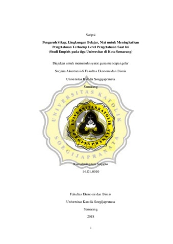 Sutjipto, Kumalaningrum (2018) Pengaruh Sikap, Lingkungan Belajar, Niat untuk Meningkatkan Pengetahuan Terhadap Level Pengetahuan Saat Ini (Studi Empiris pada tiga Universitas di Kota Semarang). Other thesis, UNIKA SOEGIJAPRANATA SEMARANG.