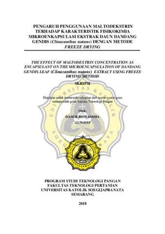 RISWANDHA, DANUR (2018) THE EFFECT OF MALTODEXTRIN CONCENTRATION AS ENCAPSULANT ON THE MICROENCAPSULATION OF DANDANG GENDIS LEAF (Clinacanthus nutans) EXTRACT USING FREEZE DRYING METHOD. Other thesis, UNIKA SOEGIJAPRANATA SEMARANG.
