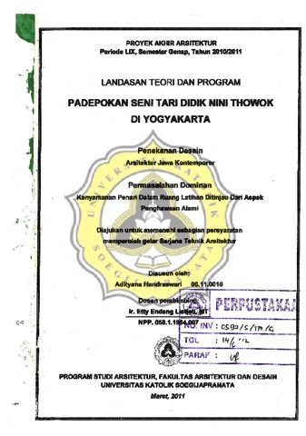 HENDRASWARI, ADITYANA (2011) LTP PADEPOKAN SENI TARI DIDIK NINI THOWOK DI YOGYAKARTA Penekanan desain : Arsitektur Jawa Komtemporer. Other thesis, Unika Soegijapranata Semarang.